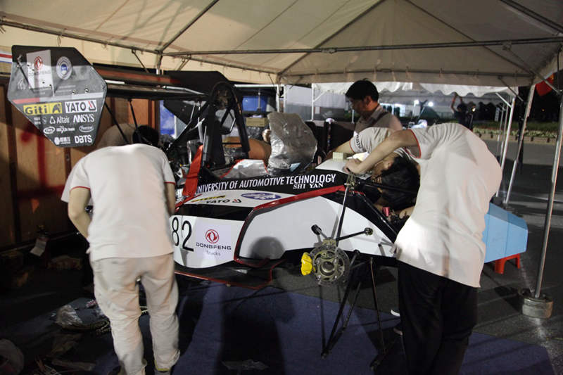队员们在小憩之后便进行二检、三检和四检,分别为赛车斜台测试、质量称重、噪音测试和制动测试。赛车顺利通过二检和三检,在四检制动测试中遇到了麻烦。在制动测试区,制动组组长突然发现制动管路破裂,队长余晓伟立马指挥车队返回P房进行赛车制动的抢修,此时离当天车检结束还差一个半小时。队员们一起投入到了赛车制动系统的紧急抢修中,为安全起见将赛车所有管路和制动液全部更换。经过一个小时的抢修后,再次将赛车推至制动测试区,由于车检时间即将结束,所以前来进行制动测试的车队较多,又到了我们车队进行制动测试,所有人的心都提到了嗓子眼等待车检通过,裁判挥动绿旗后,赛车加速前进,结果还是没有在规定区域内四轮抱死。裁判建议将胎压调低一些,随后再次将车推至修理区,将胎压和其他参数进行了调节,不料在赛车刚调完数据后,制动测试时间刚刚结束,无耐,赛车只能推回P房区,遗憾的是没能在车检第一天全部过车检(一检、二检、三检和四检)。
