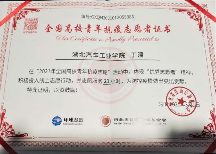 车辆201全体同学具有高度的社会责任感。全体同学在大学期间中积极参加志愿活动,全班志愿活动参加率达100%,志愿时长最高175.5小时。乐于奉献,用行动回馈祖国,车辆201班始终在路上。