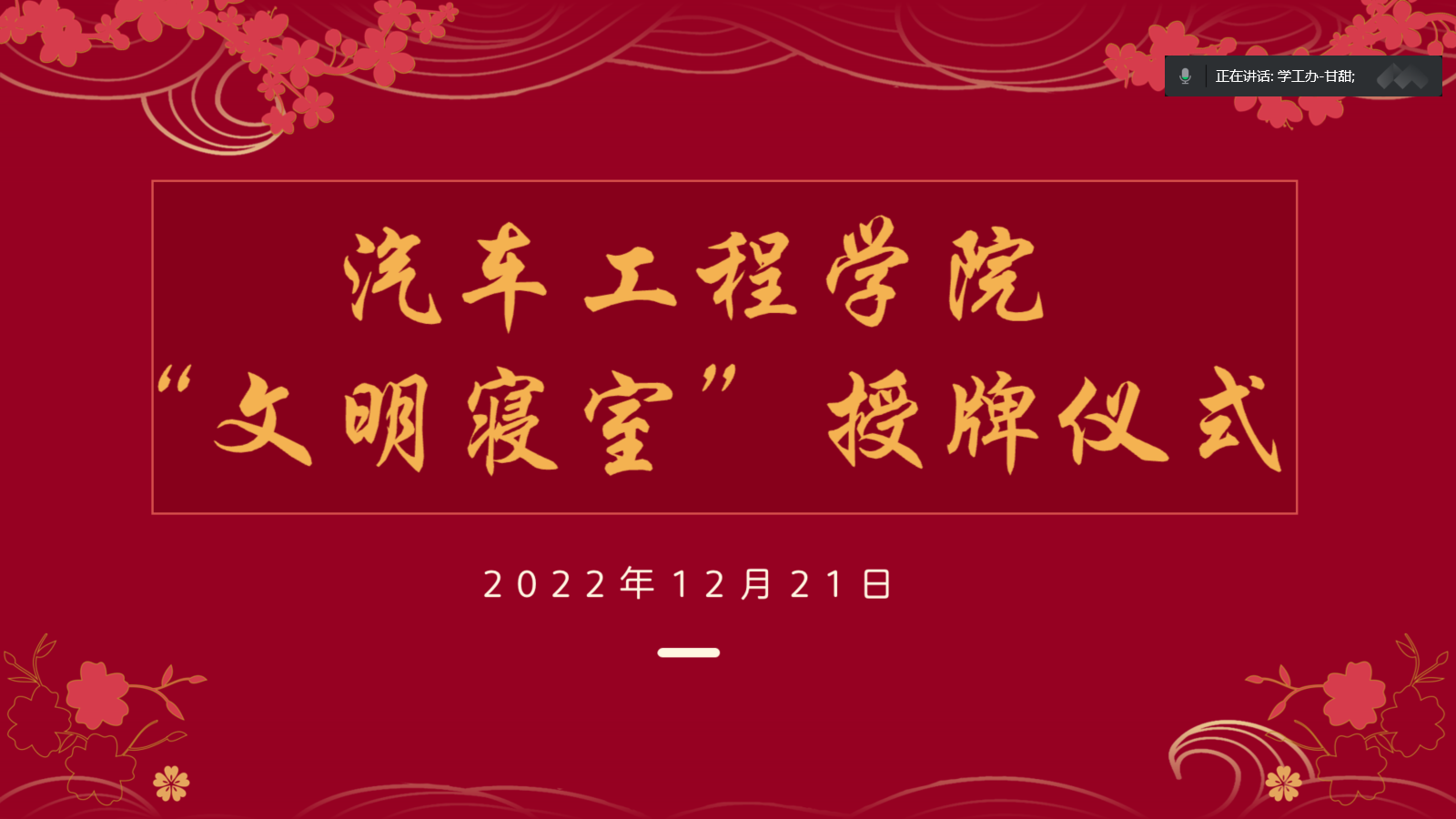为进一步加强寝室精神文明建设,引导同学们争创学习氛围浓厚、整洁文明、舒适优美、文明和谐的居住环境,营造健康、积极、向上的员工宿舍文化氛围,bw必威西汉姆联官方网站于2022年11月25日启动“文明寝室”创建活动,各年级同学积极参与。2022年12月21日晚,公司为在此次活动中表现优异的寝室举行了授牌仪式。bw必威西汉姆联官方网站辅导员甘甜和各文明寝室成员代表参加了此次会议,会议以线上形式进行。
