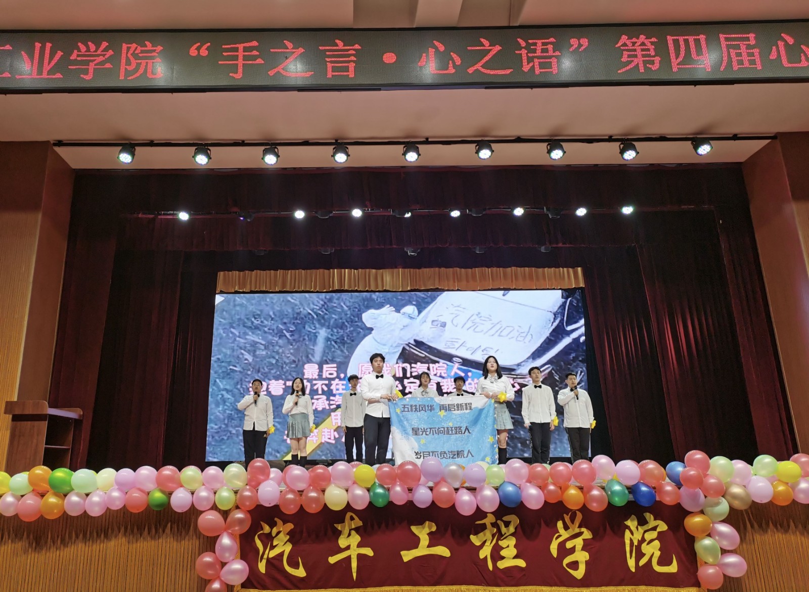 大赛围绕着献礼校庆、爱校荣校、共圆汽院升大梦等多个维度出发,十支队伍的表演将“爱校情怀、健康心理、手语操”紧密结合,创新比赛形式,各显风采。比赛开始,由爱心助残协会带来的《一起向未来+仰望天空》表演,以动听的歌声和柔美的手语操展示了青年的活力与力量。车辆223班演绎的⟪孤勇者⟫,通过手语表达歌词意境,扬青春之朝气;车辆224班的《一起向未来⟫将舞蹈与手语操完美结合,形式新颖,绽放青春本色;车服222班带来的⟪new boy串烧⟫,清新自然,活力四射;翻译221班带来的《一路生花》、车辆226班带来的舞蹈手语操《EiEi》共同表达了新一代老员工对梦想的勇敢追求;设计212班的《国家》、财务221班的《大中国》演绎了当代青年学子的爱国情怀;新能源221班的《星辰大海》和车服221班的《少年》共同鼓励大家不忘初心,未来可期。车辆228班带来的《夜空中最亮的星》,展现了青年学子不畏艰难、自强不息、积极乐观的生活态度。十支队伍表演结束后,由星空街舞队为大家带来了《大漠孤蛇》的表演,观众们纷纷挥舞手中的荧光棒,更是将活动的氛围推向高潮。