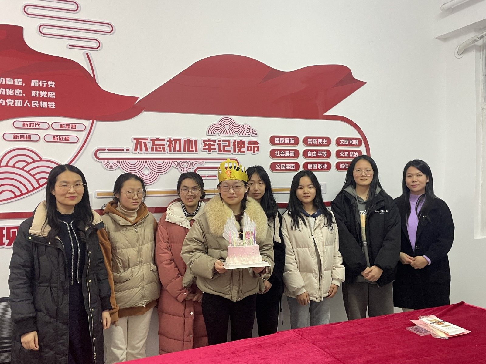 205宿舍的六个女孩一起唱响生日歌,分享了生日蛋糕,并与杜昕俊、周彬等一行进行了轻松愉快的交流。在交流的过程中,杜昕俊等详细询问了六位同学的学习、生活情况,并叮嘱同学们在知识学习上要夯实基础、提升能力、刻苦钻研、勇于创新、做好规划;在班级工作上要勇挑重担、尽职履责、学思践悟、争当表率;在室友关系上要和谐相处,真诚包容、尊重理解、互帮互助;在生活上要积极向上、心理健康、乐观开朗、平安成长。
