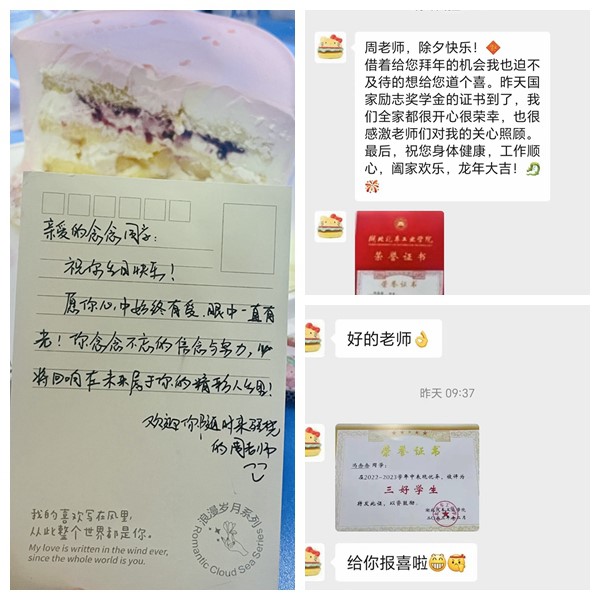 据悉,车辆221班的冯念念同学是bw必威西汉姆联官方网站分党委副书记周彬的结对员工,她所在的205宿舍也是周彬的结对宿舍。结对大半年来,周彬时常与冯念念谈心谈话,了解生活学习中的困难,引导做好学业和职业生涯规划。2024年春节,在收到公司寄来的国家励志奖学金和评为校级“三好员工”后,冯念念第一个给老师报喜。近日,在谈话过程中得知3月6日是她的生日后,周彬当即决定为她和结对宿舍过一个集体生日,亲手为冯念念带上了生日帽,送上了生日蛋糕和亲手写的生日祝福。