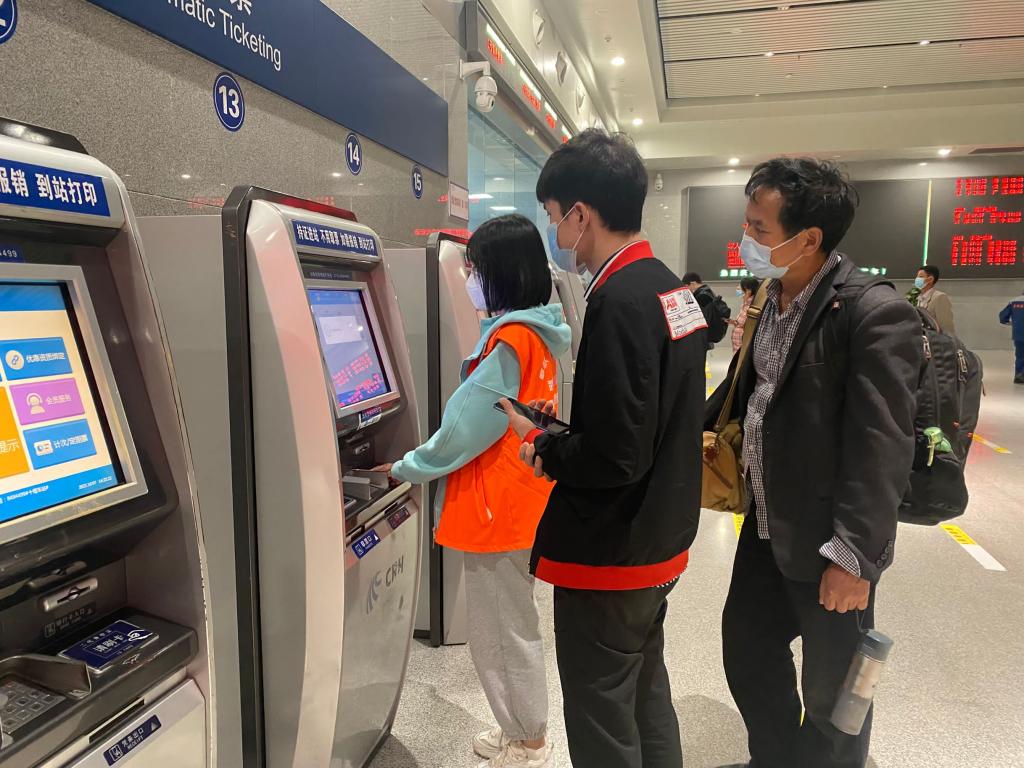 在服务过程中,志愿者们发现部分旅客不会自主使用自动印票机以及购买员工票后无法绑定员工证等问题。因此,志愿者们主动提出在自动售票机和售票大厅旁引导旅客正确取票,确保他们及时登上列车,平安抵达目的地。