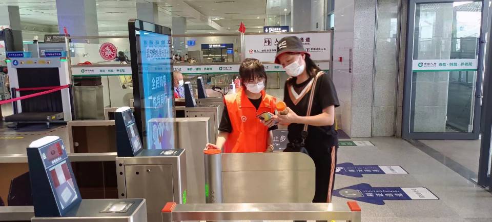由于国庆假期,火车站迎来了以探亲、旅游为主的客流高峰,志愿者们很早便抵达了目的地,并且在火车站完成了整整一天的志愿活动。活动期间,志愿者们合理分工,有条不紊,以两到三人为一组,分别在火车站各个区域开展工作,其中火车站进站口为重中之重。小火柴队员们负责维护进站次序,帮助旅客正确出示行程码;在检票口处引导旅客刷脸快速进站,以防止进站口拥堵。除此之外,几组队员与火车站工作人员一起负责维持候车室秩序、为旅客答疑解惑、帮助进出站的旅客提拿行李等工作。