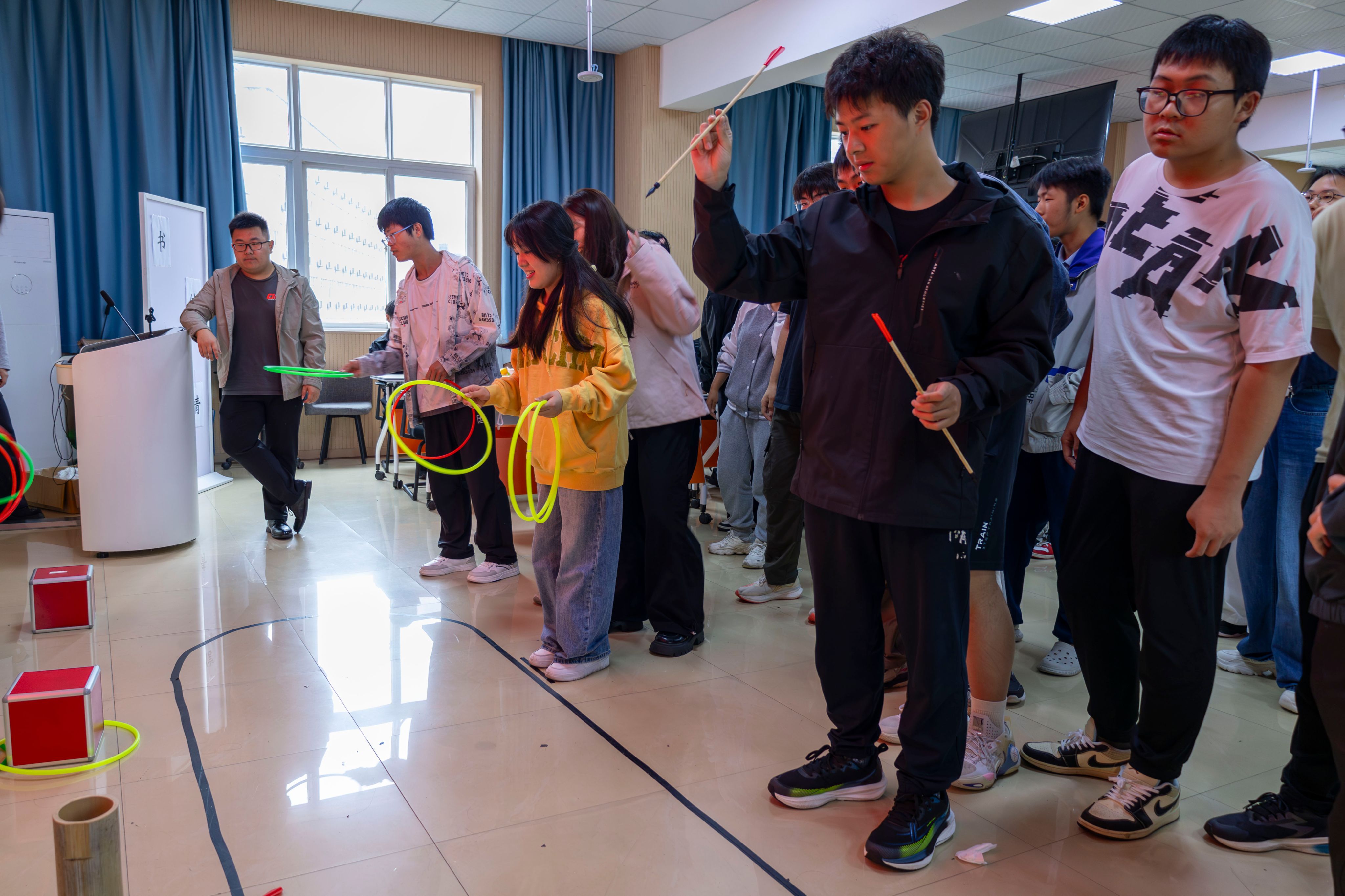 活动现场热闹纷呈,在“创意中秋摆盘”环节,师生们巧用月饼、水果等食材,围绕“家国团圆”与“青春校园”主题,创作出“国庆快乐”“月亮星空”等造型别致的作品,尽显匠心与创意。随后的传统游戏中,投壶区师生切磋技艺,笑声不断;套圈区前人头攒动,同学们凭实力赢取了丰厚奖品;击鼓传花更是将欢乐传递给每一个人,拿到花的同学或引吭高歌,或挑战绕口令,现场掌声与欢呼声此起彼伏。