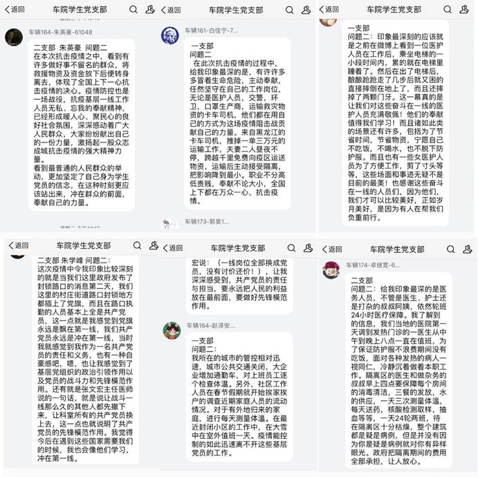 在交流讨论环节,部分党员代表分享了个人参加当地疫情防控教育宣传、志愿服务、组织捐款等工作情况,随后围绕 “在全民抗疫期间,有哪些故事和瞬间令你印象深刻,并谈谈对自己今后的影响”等问题,全体员工党员在线上踊跃发言,各抒己见。刘宇璐同志表示:看到冲在一线的各类工作者全力救治人民保护人民,我们作为一名党员要积极响应党和国家的号召,带头落实防护措施,同时呼吁提醒周围群众做好防护不要聚众,不给社会不给他人增添麻烦。郭文韬同志谈到:新型冠状肺炎疫情暴发后,医护人员承受了巨大的压力,上海市医疗救治专家组组长、复旦大学附属华山医院感染病科主任张文宏说:“一线岗位全部换成党员,没有讨价还价!”让我深深感受到共产党员的责任与担当,作为一名党员要永远把人民的利益放在最前面,要做好模范先锋作用。讨论发言环节,所有党员全部参与,人均发言文字达200字以上,以文字形式表达了自己对抗疫工作的认识和共产党员党员初心使命的理解