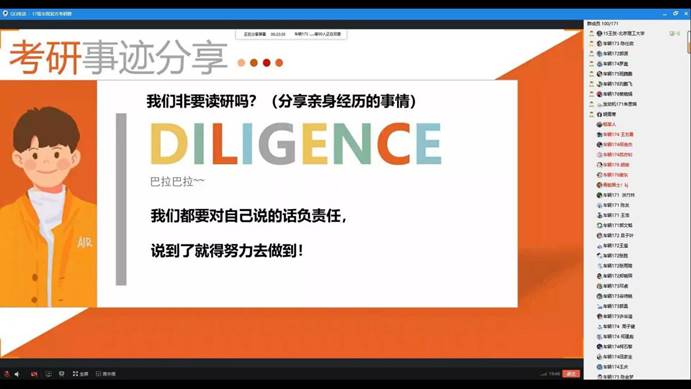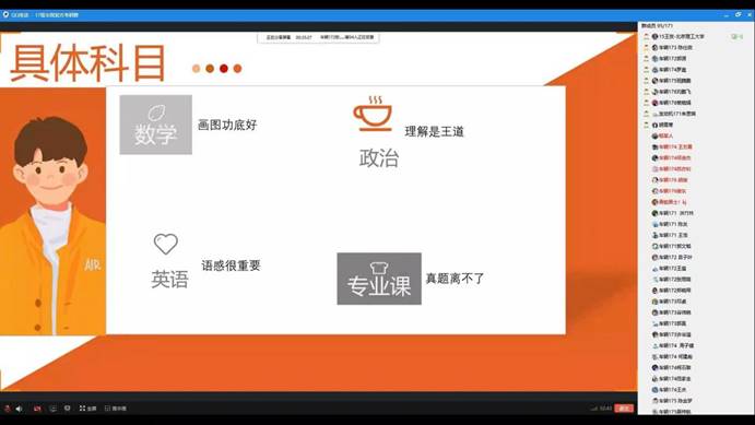 活动由员工会主席裴晓娟主持,她首先介绍了活动开展的目的、当前17级学子面临的抉择,学业职业发展压力等,强调了分享会的纪律要求并鼓励大家积极互动。随后,王贺结合自身考研前后经历,整体性提出建议大家考研必须下决心,一旦决定了就要勇往直前、绝不回头。复习过程中,平心静气、寻找盟友、客观评估是一个良好的开端,遇到复习困难要多与同学老师交流,疫情期间要充分利用现在的互联网平台开展线上复习,结合自己心仪考研公司的录考标准制定适合自己的一套循序渐进的复习计划。在具体各科目的复习经验方面,他说到英语是考研的拦路虎,提高英语水平重在平时的积累,每天抽出时间背单词、背作文都是必须坚持的,刷题也是备考最直观的提升方法。数学是工科考研的重头戏、是基础是关键,复习中除了不断的做真题,还要学会合理的利用错题集做到不在同一个问题上栽两次跟头,提高效率。政治重在理解要学会分析问题,知道出题人在问什么、自己要答什么,要做到答题有理有据。而专业课要学会把自己从书本上学习的基础知识进行提升,结合多重资料,扎扎实实巩固和提高。在互动交流环节,王贺耐心解答了每一名同学们的提问,还留下了联系方式和详细的复习笔记。他寄语备考的学子们:“考研路上不是一个人在战斗,我们都要对自己说的话负责任,说到了就得努力去做到,在遇到了困难时努力解决它,才能看出来你是不是真正的在用心前进”。