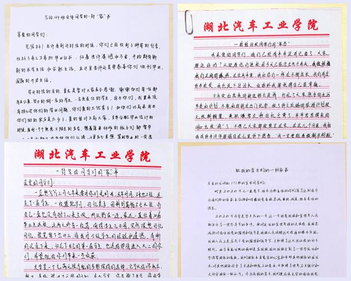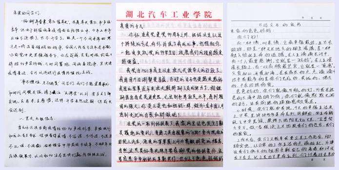 2018年入职的辅导员李雅琨给在自己所带的2018级全体员工的手写家书中回顾了自己与同学们一起成长的幸福于快乐,并以《时间之书》里的“年轻人,你的职责是平整土地,而非焦虑时光” 勉励同学们时光不等人,要做一个努力和自律的人,以今日的脚踏实地、勤奋刻苦赢得美好未来。辅导员、学工办主任朱政通过家书向同学们交流老员工活的重点、学习的重要等,引导同学们要学会规划自己的学业和未来并付诸实施,让自己的大学忙起来。博士、班主任毕崟也通过家书给所带的班级同学上了一堂思政课,要求同学们爱党爱国、诚实勇敢、主动担当。