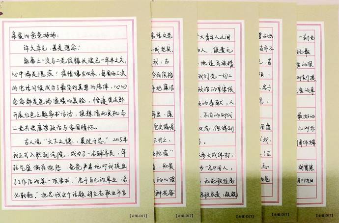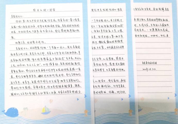 公司办公室主任周丹则把家书写给了自己的女儿,“第一次以书信的方式”跟她交流了成长带来的欢乐和幸福,并以中国传统文化教育女儿孝老爱亲、做一个有孝心的人,从小立志、做一个有目标的人,心存感恩、做一个懂的回报的人,并勉励女儿“快乐来源于成功、成功来源于努力”,要以持之以恒的努力扬起青春的风帆顺利远航。