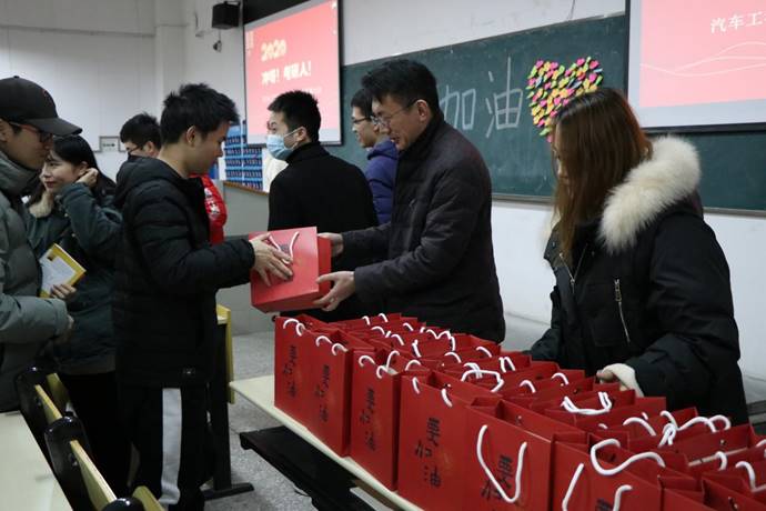 分团委书记胡霄寒主持会议,她首先指出了此次活动开展的目的和必要性,强调了考研对人生发展的重要性,并总体分析了公司近三年的考研和本科就业情况。接着,参会人员集体观看车院考研祝福视频,来自不同年级学弟学妹们的真诚祝福缓解考研学子内心的紧张和不安,伴随着现场的低年级员工们齐声高呼“学长学姐,考研加油!”,考研学子们用热烈的掌声回应了这嘹亮的祝福声。随后与会的老师们还为考研学子一一送上了公司精心准备的“考研加油包”,精美的笔记本、甜蜜的糖果、温馨的祝福卡片、轻便的油笔让每个员工感受到了沉甸甸的暖意,每一句鼓励、每一声叮咛、每一个微笑都像无形的太阳温暖着大家的心田。接受爱心礼包后,车辆176张德俊作代表考研群体进行了简短的发言,表达了所有考研人冲刺的决心和信心。李秀峰在总结中通报分析了今年的报考形势,鼓励大家在严峻的形势中把握住自己的机遇,并谈到“考研的过程就就是一个坚持奋斗的过程,道阻且长,只有坚持到最后的才会胜利。剩下不到一个月,无论有任何困难,及时向公司反映,车院永远都是大家最坚强的后盾。我们坚信,你们一定会收获希望,成功上岸!”