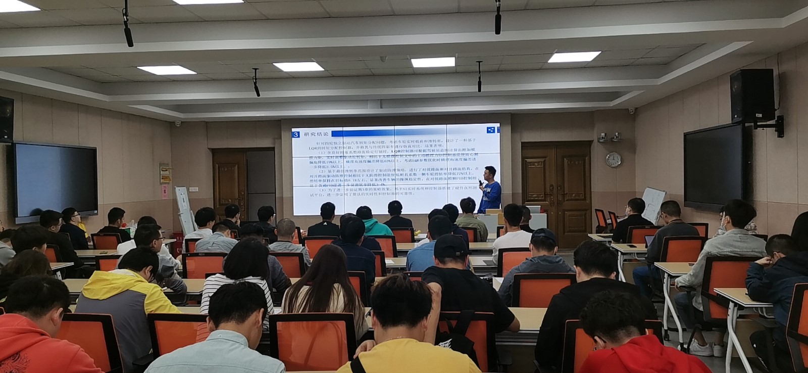 首先张羽为大家做了主题为四轮独立驱动车辆驱动力矩分配控制研究的报告,他介绍了电动汽车根据驱动形式分为集中式驱动和分布式驱动,并重点讲解了分布式驱动具有传动系统高效、底盘布置灵活、控制响应迅速更容易实现主动横摆控制的特点,同时说明了对于分布式驱动车辆转矩分配控制研究的必要性和研究意义。