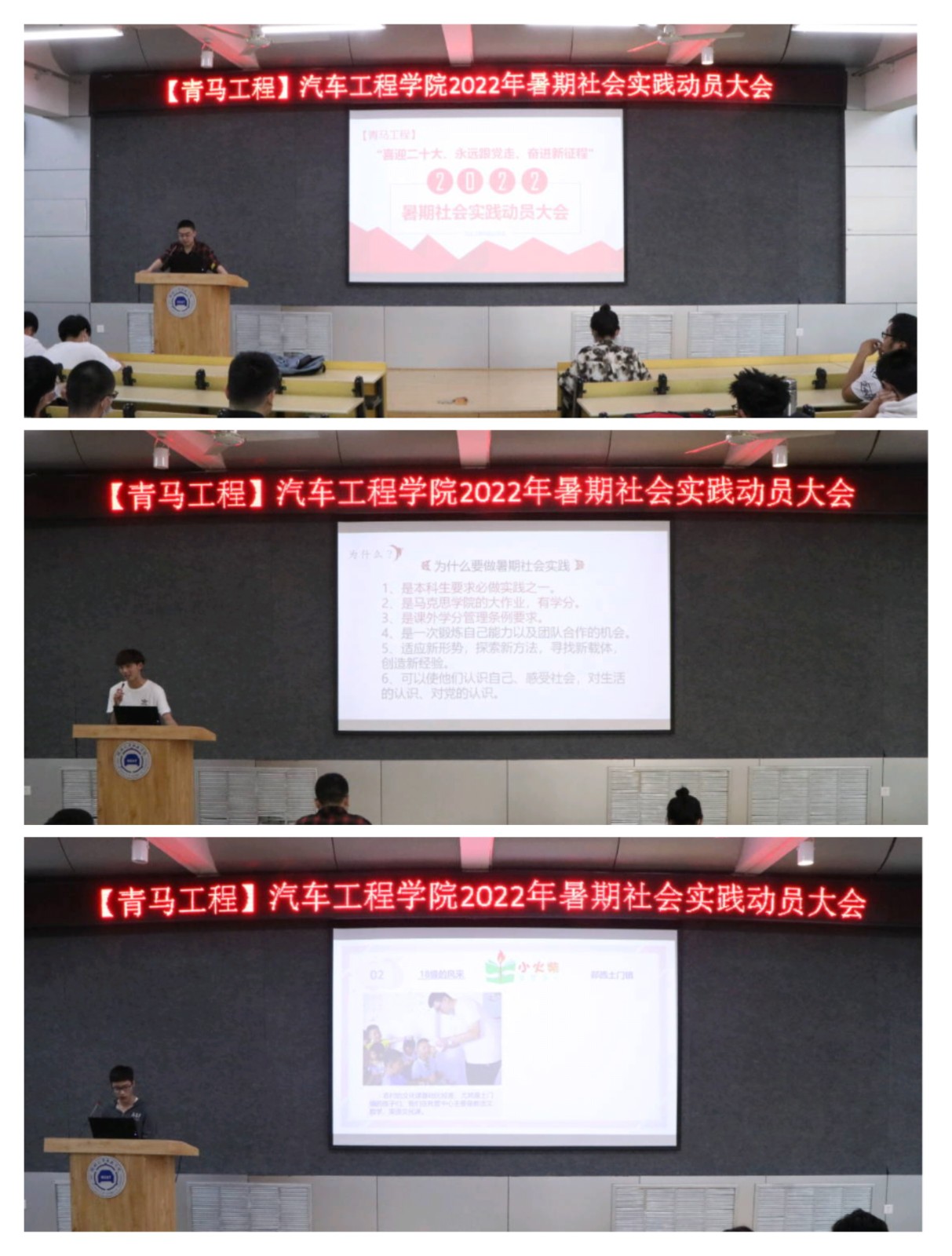 在优秀团队分享经验环节,王子翔为同学们讲述了启为团队荣获全国百强社会实践团队的成功经验,并讲解了在暑期社会实践过程中可能遇到的问题及解决办法,鼓励大家不仅要有冲刺国奖的信心,还要有不放弃、不气馁的恒心。随后,金浩东向同学们展示了小火柴志愿服务实践团队近几年来获得的各种奖项成果,分享了团队制作的活动视频与风采相册,引发在座同学们的热烈反响与密切关注。新能源汽车211班的甘卓佳不禁感慨道:“今年的暑假,我也要像学长们一样收获如此有意义的社会实践活动!”