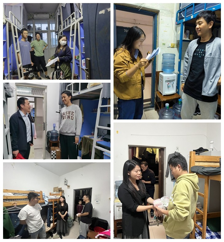 27日晚,公司班子成员带领学工办全体辅导员,又分别深入桃园、红枫、李园、西区等员工宿舍,逐间寝室走访,为全体车院员工送上节日祝福,询问假期去向和安排,仔细察看宿舍生活设施是否完善、损坏物品是否及时得到维修、是否有违规电器和物品,并就宿舍卫生、宿舍管理、安全隐患等问题与同学们亲切交流,重点强调假期请销假要求和安全注意事项,提醒同学们时刻保持警惕,谨防电信诈骗,确保个人人身和财务安全。