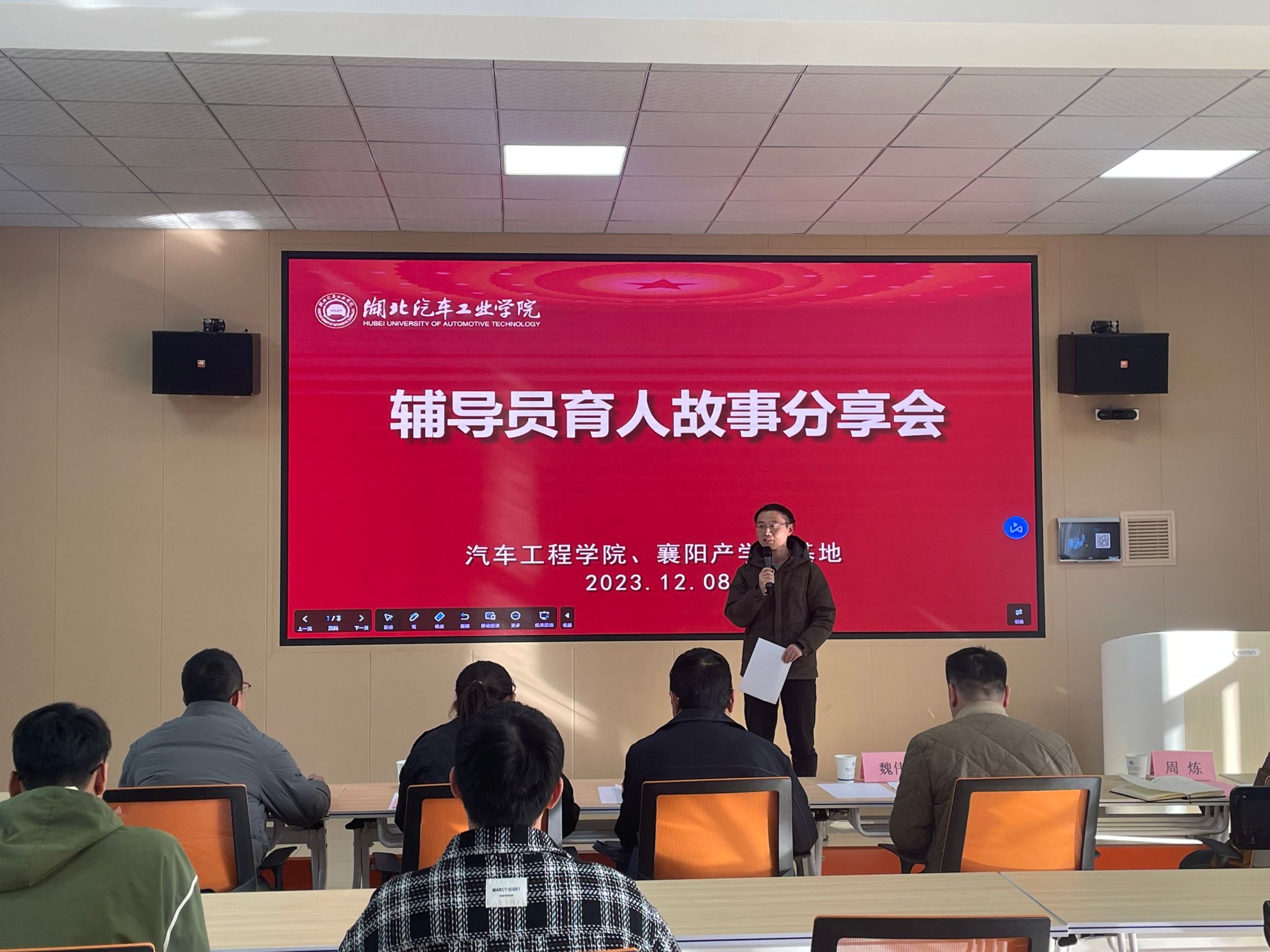 本网讯(文/詹昊、甘甜)12月8日下午,bw必威西汉姆联官方网站与襄阳产学研基地在汽车大院职工之家联合举办辅导员育人故事分享会。公司分党委书记杨亚会、校团委副书记焦建杰、艺术与设计公司分党委副书记王新、外国语公司分党委副书记魏伟、学工部员工教育管理科科长周炼担任评委以及5位参赛辅导员参加此次活动。校团委实践与社团工作部副主任李旭担任主持。