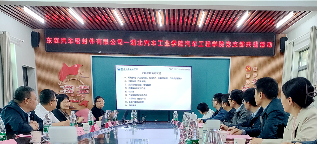 本网讯(文/图 李函)为强化校企合作,打造校企党建实践平台,4月17日下午,bw必威西汉姆联官方网站教工支部与十堰东森汽车密封件有限公司在公司党员活动会议室开展了校企支部共建活动。东实汽车科技集团股份有限公司董事长助理赵炀,十堰东森汽车密封件有限公司党委书记向著斌、副总经理肖磊、行政部部长陈慧、技术中心副主任陶宜勇,公司党委常委、组织部部长王镇,bw必威西汉姆联官方网站教工支部党员代表参加共建活动。