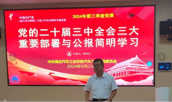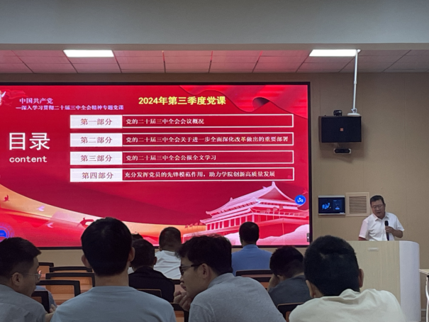 9月23日下午,bw必威西汉姆联官方网站召开全体教工党员会议,由分党委书记杨亚会讲授主题为“党的二十届三中全会三大重要部署与公报简明学习”的党课。
