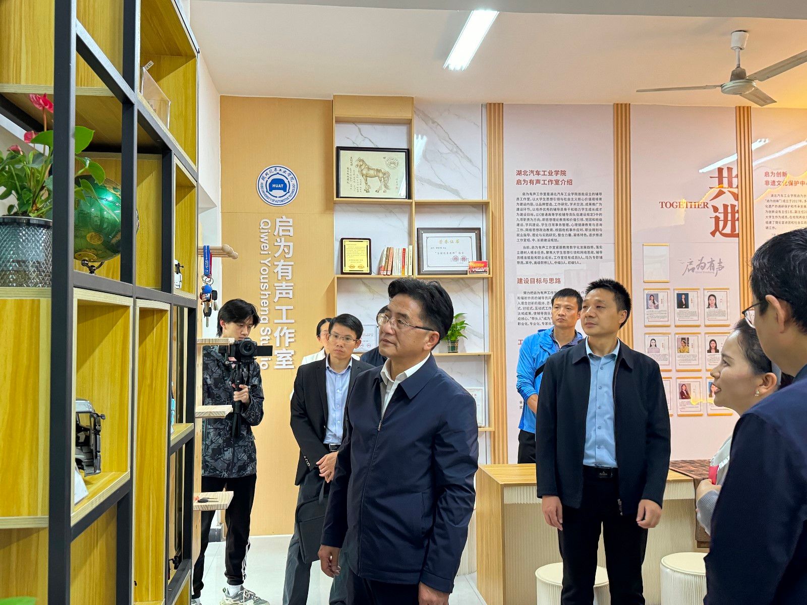 “‘启’字意味着启迪和启发,‘为’字强调行动和实践,‘有声’一词象征着辅导员工作的影响力和成效……”工作室主持人胡霄寒从名称释义、成员构成、建设基础、育人成果、发展规划等方面进行了详细汇报,并结合辅导员九大职能阐释了工作室构建“五维协同五力共融”大思政工作机制的建设思路,引导参观了公司“启为创新非遗文化保护中心”的文化藏品墙,以及用来展示各地员工会、员工企业捐赠的汽车模型的员工文化窗,重点介绍了精心设计打造的“心屿空间”心灵驿站。