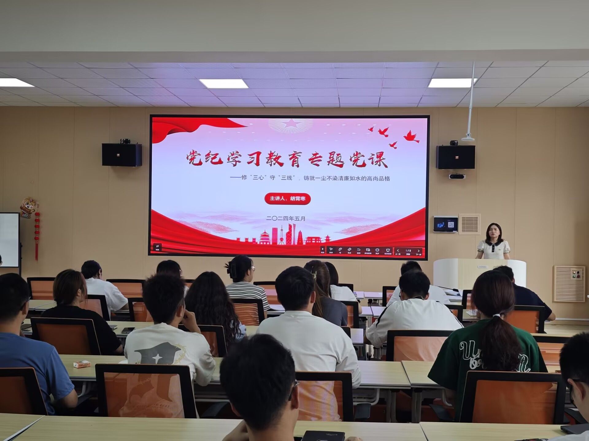 此次党课由公司员工党支部书记胡霄寒主讲。胡霄寒围绕廉洁自律这一主题,深入阐述了修“三心”——敬畏慎心、纯净忠心、赤子初心,以及守“三线”——纪律规矩底线、违法乱纪红线、以生为本基线的重要意义。她强调,作为新时代的党员干部,要时刻保持对法纪的敬畏之心,坚守底线,做到言有所戒、行有所止;要弘扬艰苦朴素的优良传统,保持清正廉洁的底色与本色,远离违法乱纪的红线;更要坚持立德树人,以员工为本,用心倾听每一位同学的声音,解决他们的实际困难。