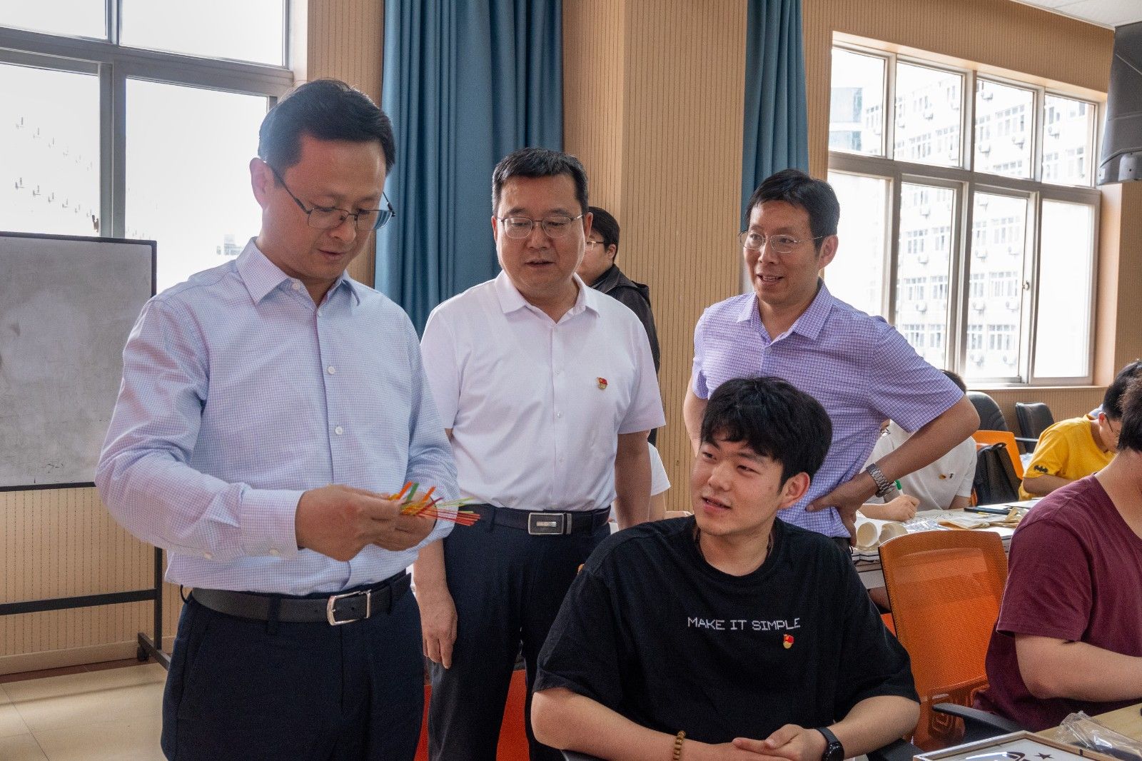 陈建平深入师生中间,与大家亲切交流,认真听取他们对作品的创意阐释和廉洁感悟。曾担任支部书记多年的郑冬黎教授一边编竹编画,一边感慨:“做出‘廉’字容易,践行‘清廉’却需终身坚守。”陈建平表示赞同,并强调“廉洁自律不仅是一条必须坚守的纪律红线,更应该内化于心、外化于行,成为每一名党员的文化自觉和行为习惯”。