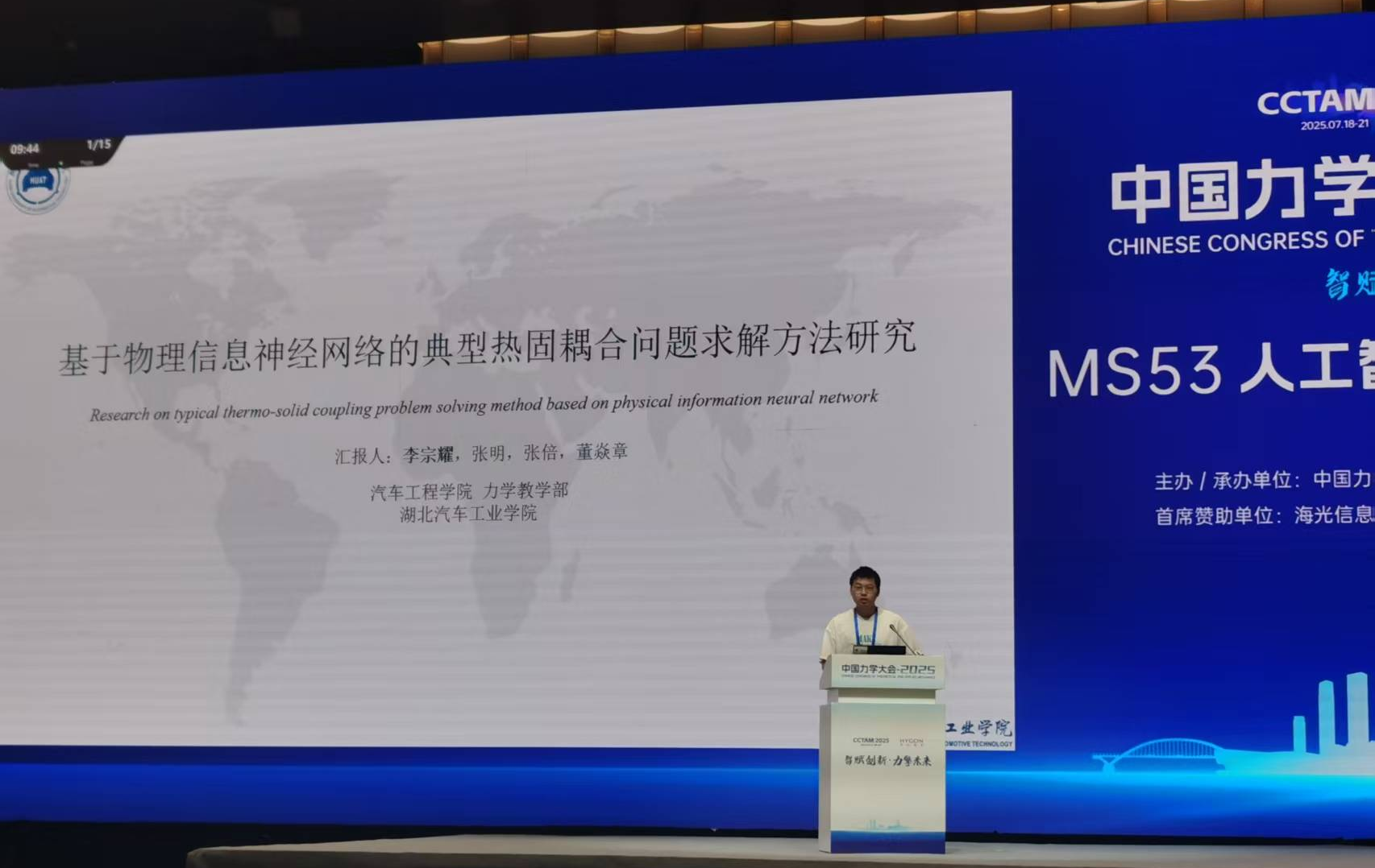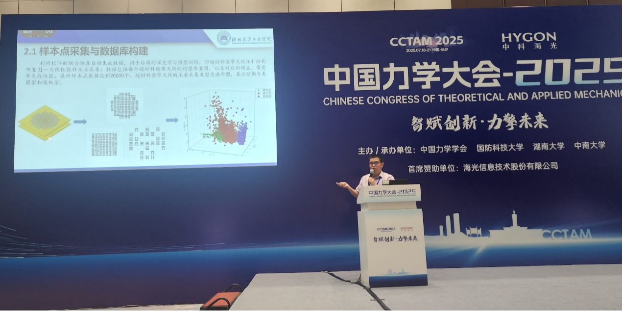 公司师生积极参加了大会开幕式、主会场特邀报告、各专题分会场报告及墙报交流等活动,认真聆听了专家学者的前沿报告,深入了解国内力学研究的最新动态、发展趋势和热点方向。会议期间,公司董焱章教授在复合材料及结构力学分会场作了题为《面向超材料微带天线拓扑结构的深度卷积神经网络性能预测》的学术报告,展示了车载超材料微带天线性能预测方面所取得的研究成果,引发了与会同行的广泛关注和热烈讨论。同时,公司研究生李宗耀在人工智能在力学中的应用分会场作了题为《基于物理信息神经网络的典型热固耦合问题求解方法研究》的学术报告,展示了公司人工智能在力学问题求解应用的研究成果,通过与众多学者的交流和学习,锻炼了研究生的学术表达与交流能力,对提升公司产品质量具有积极意义。