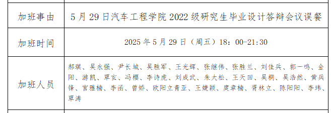 由于研究生毕业设计答辩要求,需要当天完成,特安排中午加班工作。误餐人员如上图。公示三天,如有疑问可咨询教学科研办公室0719-8239880.