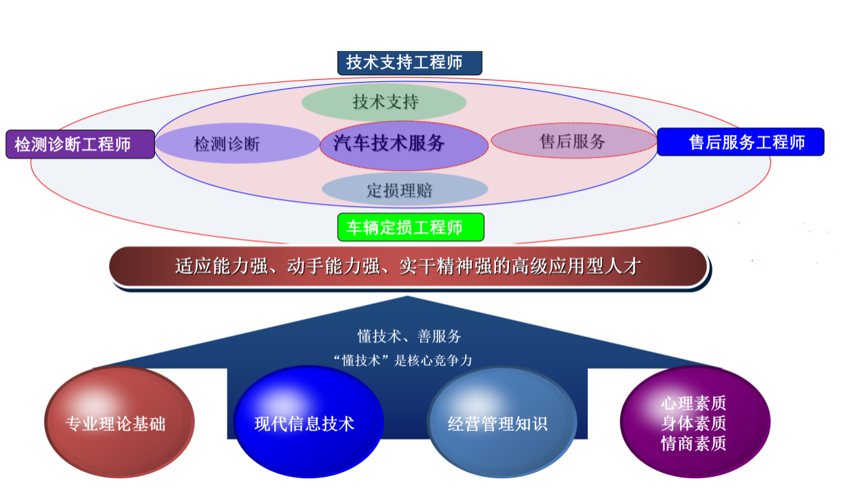 专业培养坚持“1中心,4基础,2能力,4特征”的培养特色。以培养汽车技术服务领域人才为中心,培养员工专业理论基础、现代信息技术、经营管理知识、心理素质、身体素质和情商素质为基础,使员工具备“懂技术、善服务”综合素质和能力,能胜任汽车技术支持,检测诊断、定损理赔、售后服务等领域的工作。