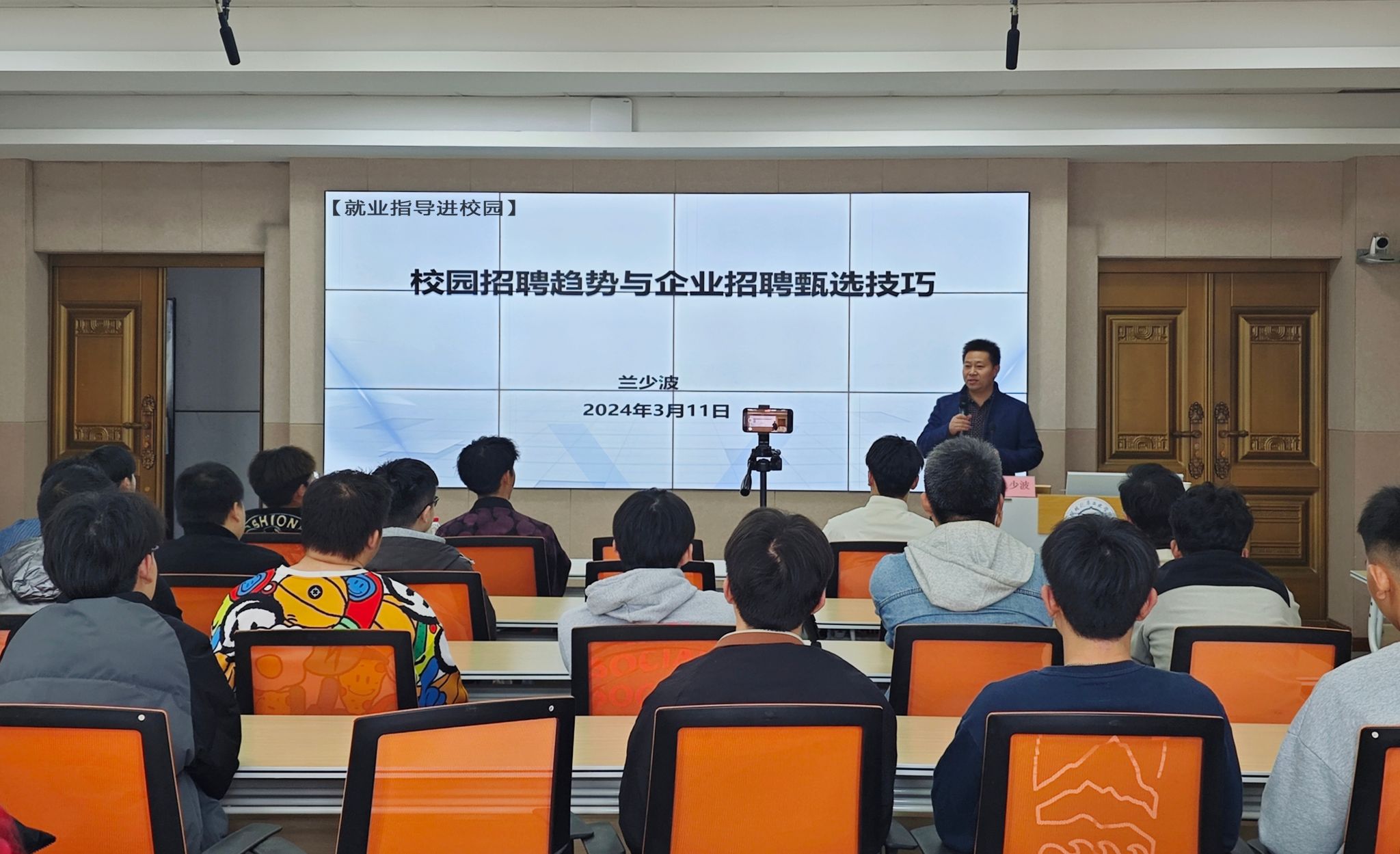 兰少波以“校园招聘趋势与企业招聘甄选技巧”为题,从校园招聘趋势、招聘面临挑战、HR如何面试、标准面试流程以及简历展示等五个方面作深入阐述,用数据分析、案例说明等形式,讲问题、剖原因、理思路、传方法,强调在求职过程中要做到心中有秤、提问有法、察言观色,为同学们提供了宝贵实用的求职建议。