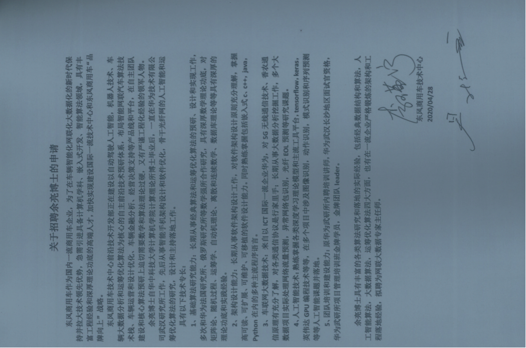 2004.09--2007.07 武汉生物工程公司计算机系专职教师,讲师 2012.09—2020.07 华为武汉研究所,历任终端架构部架构师,AI开发部算法专家 2020.07—2021.11 东风商用车技术中心先行商品开发部专家主任工程师 2021.11—2022.03 东风商用车技术中心开发管理部专家主任师 2022.03—今 东风商用车技术中心前沿技术开发部专家主任师 |