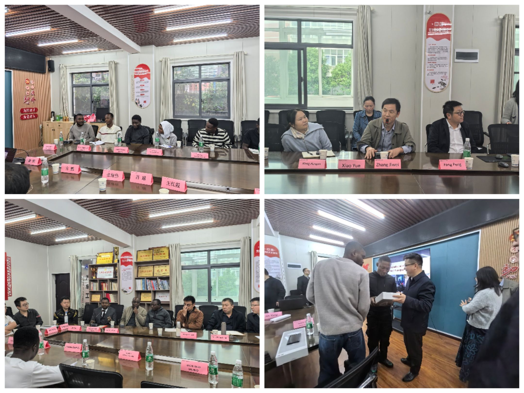 在交流环节中,2025级10位外籍研究生依次发言,分享了入学感受与学习计划。多位导师随后发言,就科研方向、课题选择等给予指导,鼓励新生积极融入学术团队。公司领导再次致辞,强调将全力支持外籍员工的学习和生活,并为他们赠送了台灯作为纪念礼物。